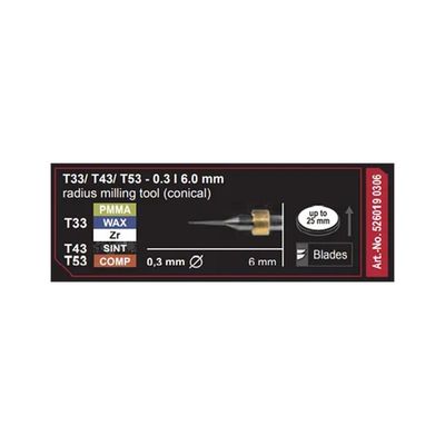 T33/T43/T53 - 0.3 | 6.0 mm radius milling tool (conical) PMMA/Wax/Zr